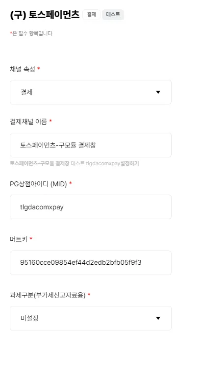 기본적으로 테스트용 상점정보 자동설정됩니다
