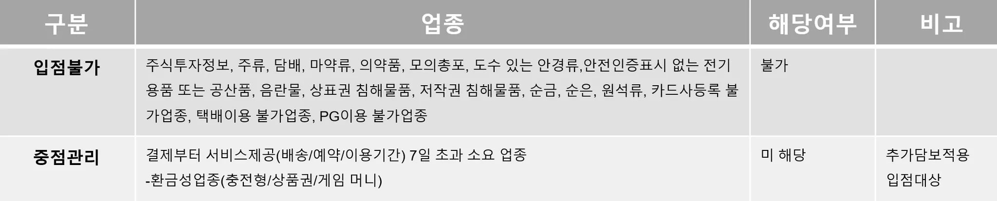유사투자자문업종(주식투자정보제공 등)은 입점이 어려울 수 있습니다. (참고 : 투자정보제공보다는 단순히 입력한 데이터를 정제하여 제공하는 형태는 입점 가능한 사례가 있음)