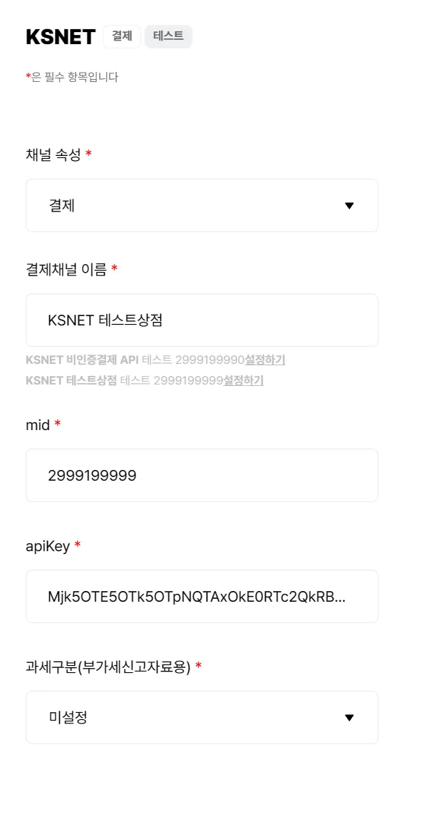 KSNET 테스트상점 테스트 2999199999 설정하기클릭