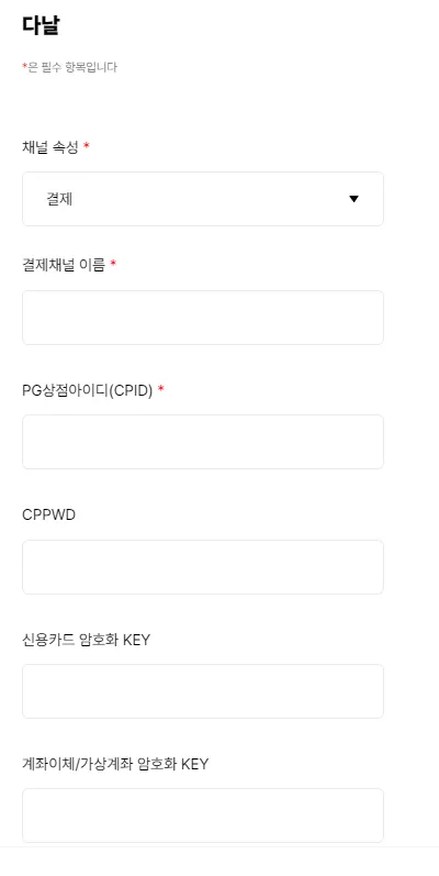 상점정보만으로는 채널(PG)의 성격을 파악하기 어려워 채널(PG)의 이름을 설정하는 용도로 구분하기 위한 필수설정 값으로 임의값로 설정이 가능합니다(단, 숫자, 공백, 글자, _, - 만 가능)