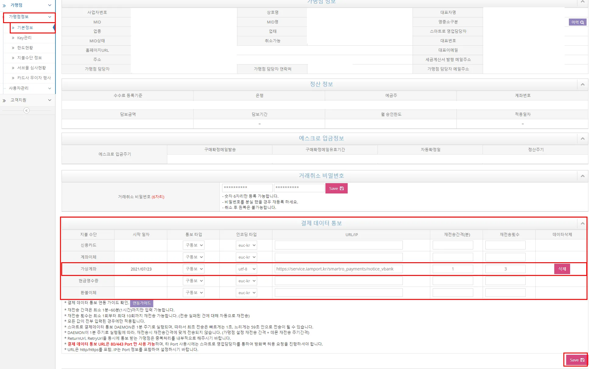 - MID : 스마트로 어드민페이지(https://www.smilepay.co.kr/)> 가맹점 > 가맹점정보 > 기본정보 에서 "MID"항목에서 확인가능