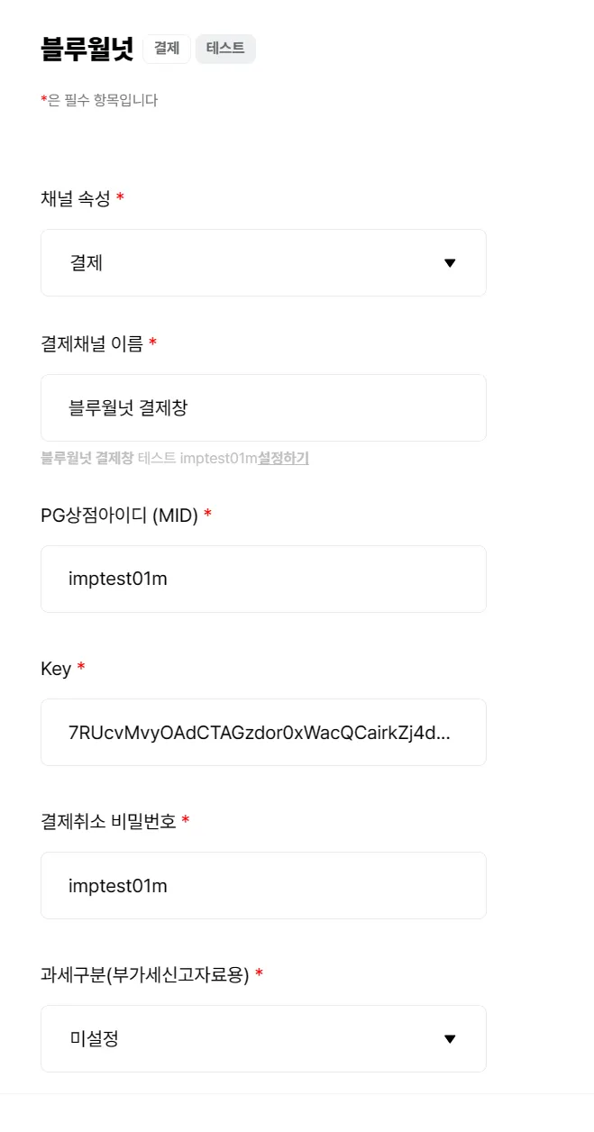 기본적으로 테스트용 상점정보가 자동설정됩니다.