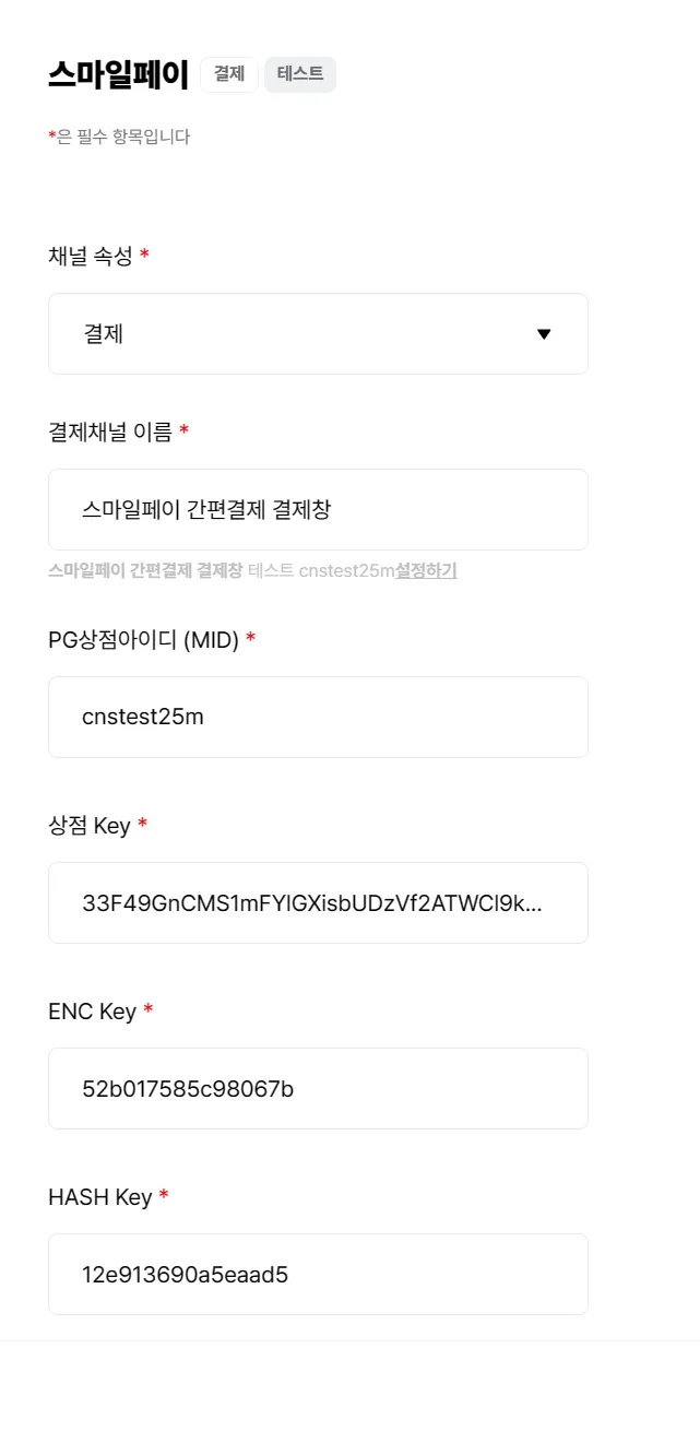 기본적으로 테스트용 상점정보가 자동설정됩니다.