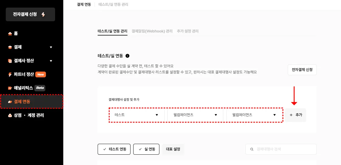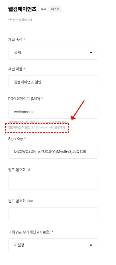 웰컴페이먼츠 일반 테스트 welcometst 설정하기클릭