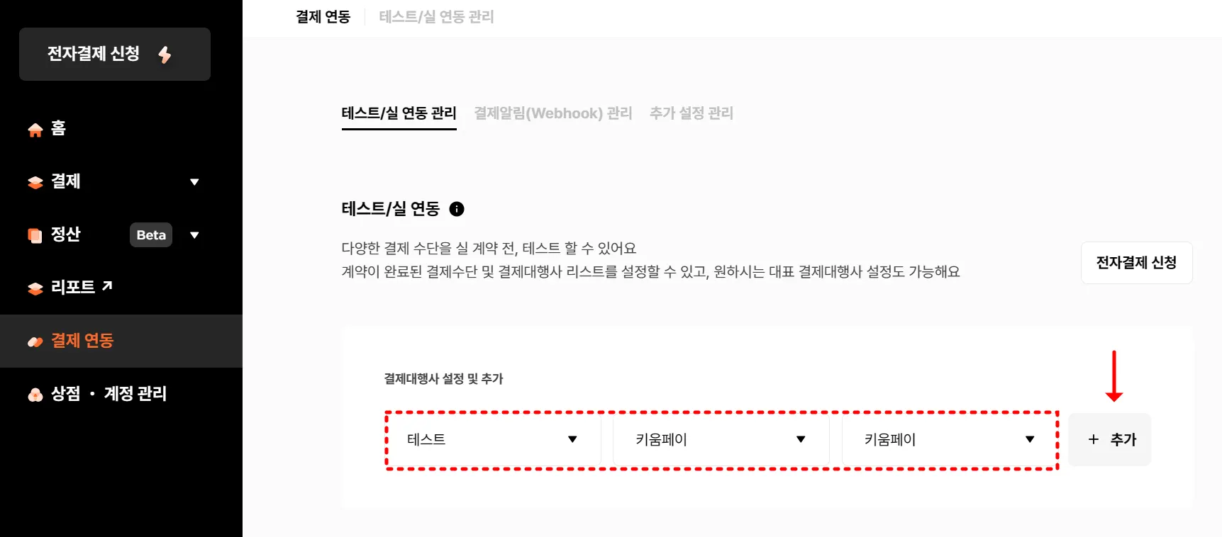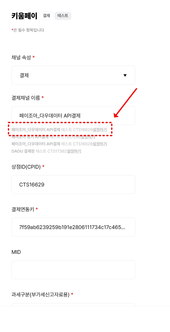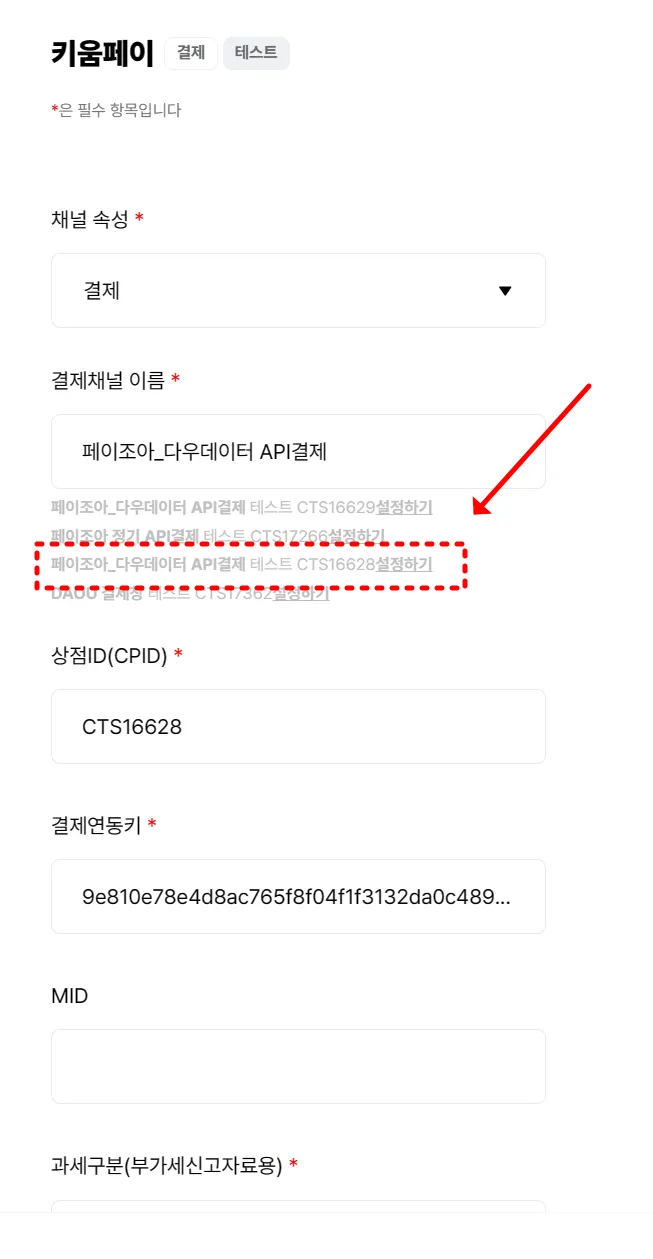 페이조아_다우데이터 API결제 테스트 CTS16628 설정하기 클릭