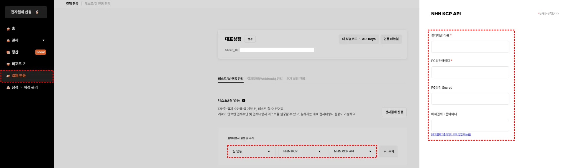 포트원 관리자콘솔  > 결제 연동 > 실 연동 관리 > 결제대행사 설정에서 PG사 "NHN KCP / NHN KCP API" 선택하시고,  KCP로부터 발급받으신 PG상점정보 입력 후 [전체저장] 버튼을 클릭 해 주세요.