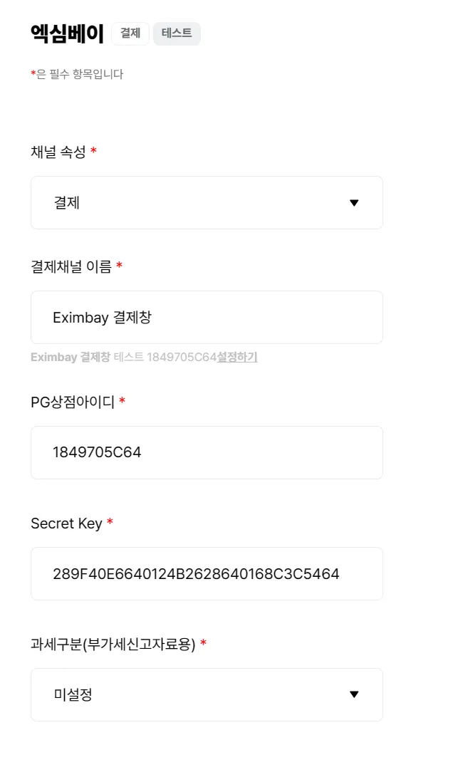 기본적으로 테스트용 상점정보가 자동설정됩니다
