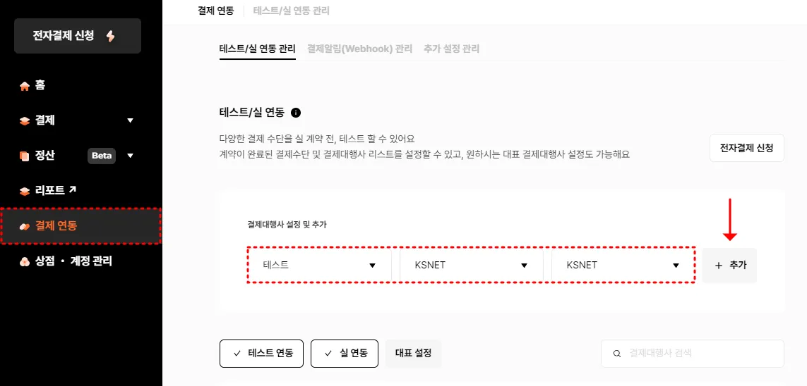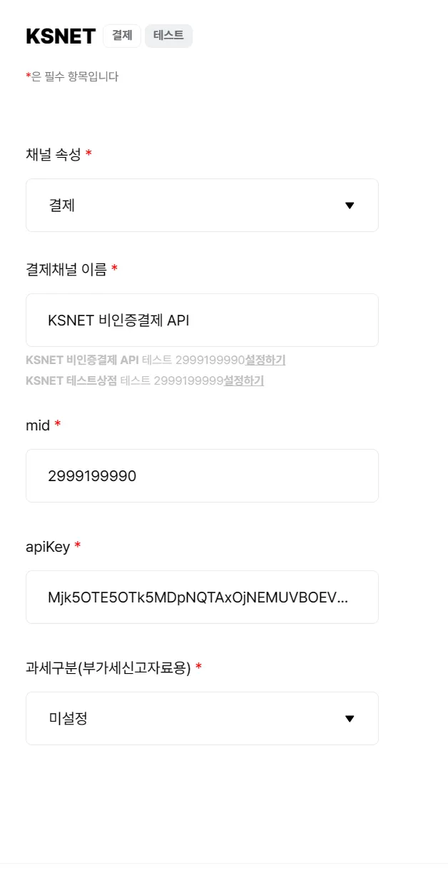 KSNET 비인증결제 API 테스트 2999199990 설정하기클릭