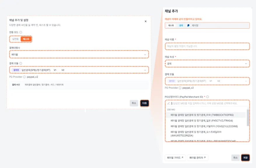 포트원 관리자 콘솔 → 결제 연동→ 채널관리 → 테스트 [+채널추가] 클릭 → 페이팔 / 일반결제(SPB)/정기결제(RT) 선택 → 테스트용 PayPal 판매자 ID ’이용할 국가’ 선택 → [저장] 클릭