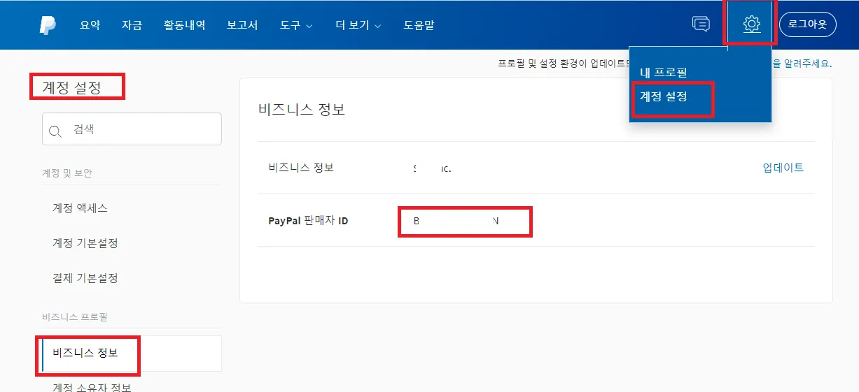 PayPal 판매자 ID 조회 경로 : 페이팔 홈페이지 로그인 > 계정 설정 > 비즈니스 정보 >’ PayPal 판매자 ID’에서 확인이 가능하며, 해당 ID 를 포트원 콘솔 ‘PayPal Merchant ID’에 설정 해 주세요.