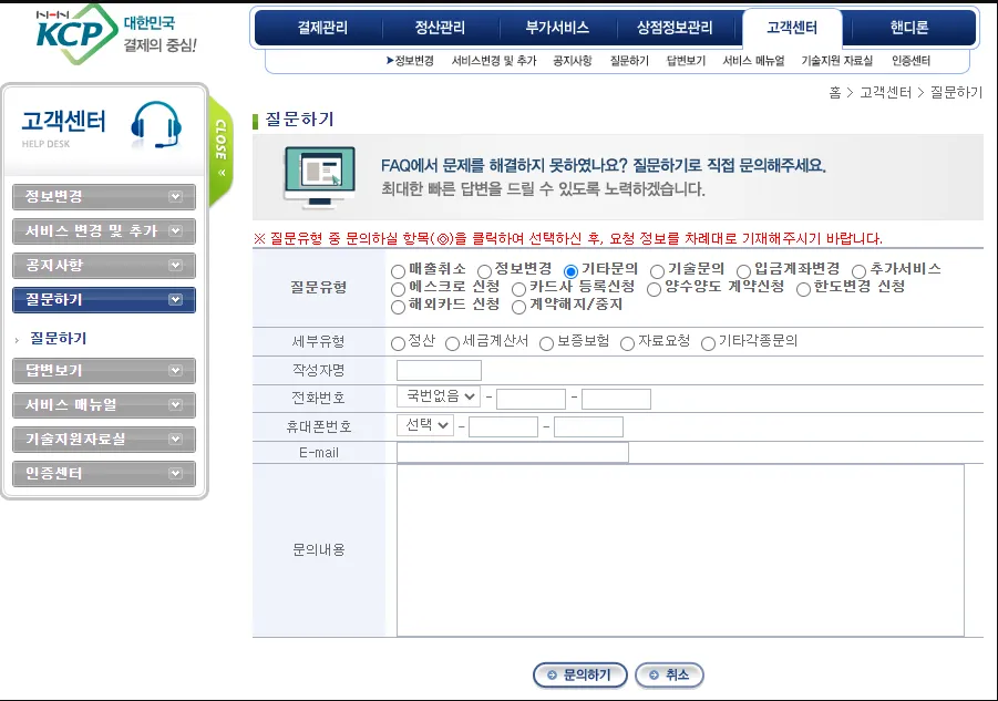 고객센터 > 질문하기 > 기타문의 > 기타각종문의 '포트원용 간편결제 사이트코드 추가요청' 기재