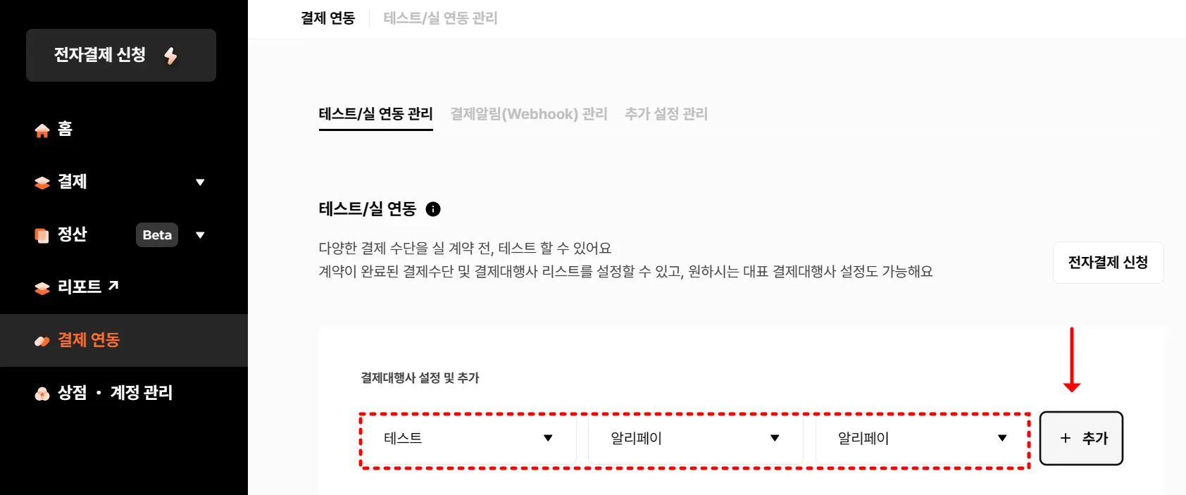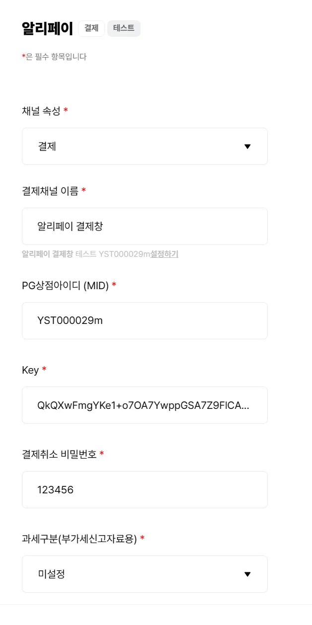 기본적으로 테스트용 상점정보가 자동설정됩니다.