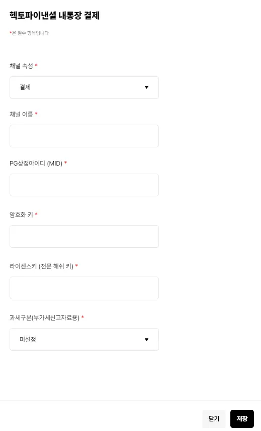 상점정보만으로는 채널(PG)의 성격을 파악하기 어려워 채널(PG)의 이름을 설정하는 용도로 구분하기 위한 필수설정 값으로 임의값도 설정이 가능합니다. (단, 숫자, 공백, 글자, _, - 만 가능)